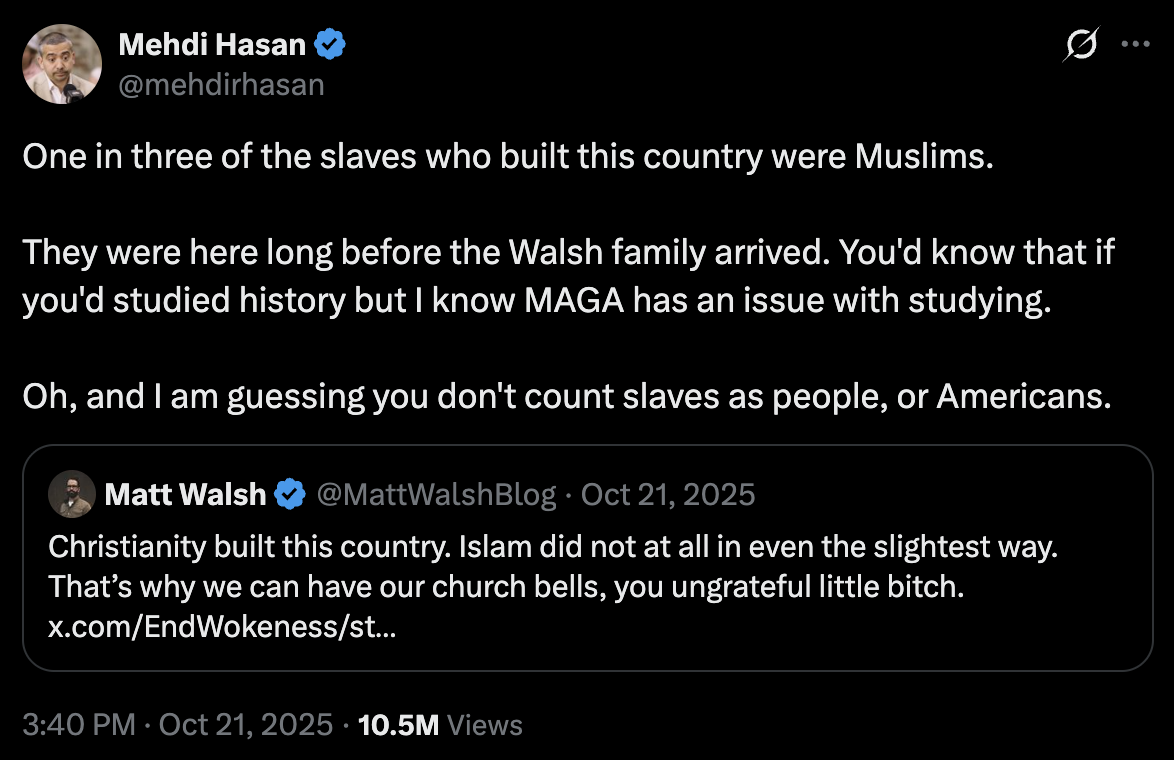 It started after Walsh, who — in response to Hassan claiming the Muslim call to prayer was just as American as the sound of church bells — posted: “Christianity built this country. Islam did not at all in even the slightest way. That’s why we can have our church bells, you ungrateful little bitch.”